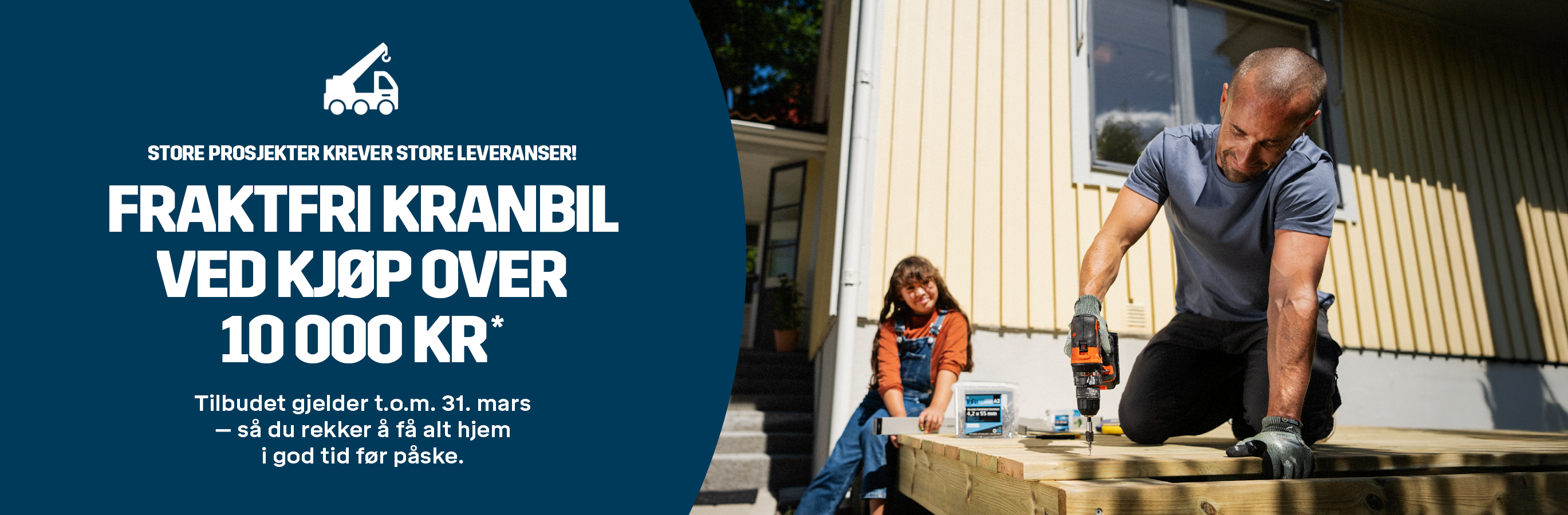 Planlegger du et større prosjekt? I løpet av mars spanderer vi kostnaden for standard hjemlevering når du handler for minst 5 000 kr. En smart måte å få byggematerialene levert hjem på!