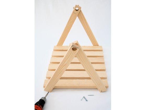 Monter deretter sidene ved å plassere sidestykkene på hverandre og borr hull tvers gjennom med et 22mm treborr. Sidene har en selvlåsende konstruksjon så fort håndtaket er på plass, slik at det holder å skru dem fast i bunnplaten. For best mulig stabilitet skrur du inn i bunnplanken.