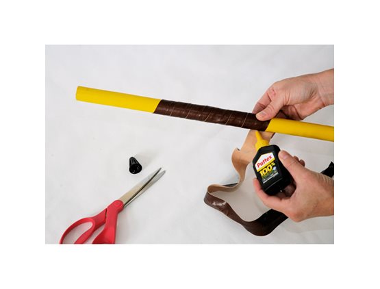 En fin detalj for vedkurven er om du binder en lærrem rundt håndtaket, men først må rundstaven males to strøk med tørketid i mellom strøkene. Når malingen er helt tørr kan lærremmen limes fast. Bruk superlim som kan påføres på både tre og lær. Lim og tvinn lærremmen rundt rundstaven. La det tørke og press så håndtaket fast i hullene.