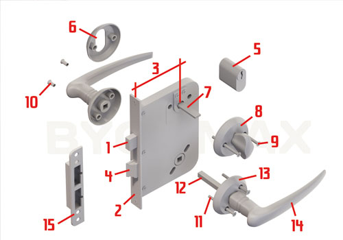 Det finnes flere navn på skruene til de ulike låsdelene slik som sylinderskruer (9) og håndtaksskruer (11) til tross for at det er samme gjenge (M5). Til låsesylinderen brukes to sylinderskruer som er 28 mm lange og til sylinderkappen en lengre variant. Til håndtaket (14) behøver man ofte hylsemuttere (10), noe som følger med når du kjøper skruer til håndtak. Felles for både sylinderskruer og håndtaksskruer er at de kan behøve å klippes eller kappes med en baufil for at lengden skal passe til din dørtykkelse. Låsedeler selges både i sett (f.eks. et håndtak (8) inklusive vriderpinne (7), sylinderkappe (6) og lange sylinderskruer (9)) eller som separate produkter.