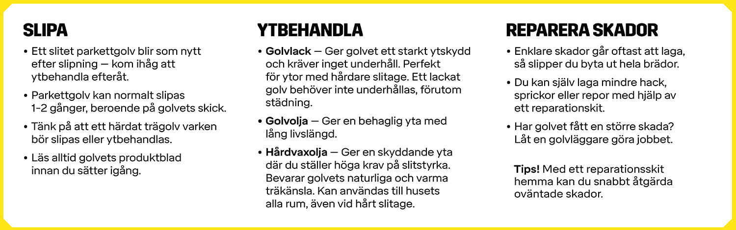 Om ikke grepene ovenfor skulle hjelpe, gjenstår det å enten slipe parketten eller erstatte de skadde delene. Hvis du vil slipe parkettgulvet, må du først undersøke om det er blitt slipt tidligere, og hvor tynt slitelaget er nå. Et parkettgulv kan slipes omtrent to–tre ganger før det blir for tynt. Et gulv i heltre kan slipes mange ganger så lenge trelaget ikke blir tynnere en 2,5 mm. Hvis trelaget er i orden, kan gulvet slipes og bli så godt som nytt. Ikke glem å behandle gulvet med lakk eller olje etterpå.